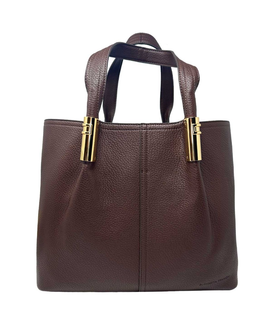 Borsa tote grande realizzata in materiale sintetico effetto pelle marrone. Dalla shape essenziale ed elegante, è impreziosita dai dettagli in metallo dorato con logo. Logo al fondo