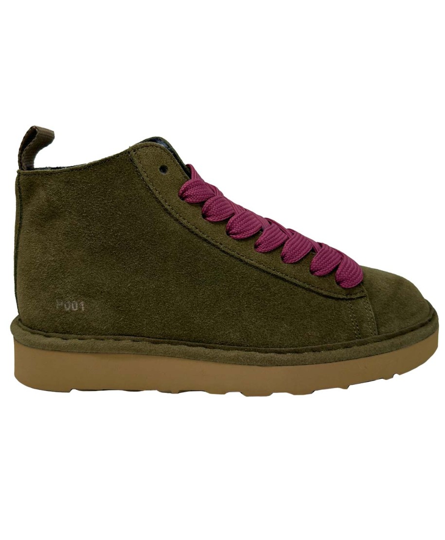 Polacchini donna P001 con tomaia di camoscio kaki, lacci a trama larga fucsia e fodera interna di faux fur. La P001 con le sue linee pulite rappresenta il perfetto equilibrio fra design e comfort.