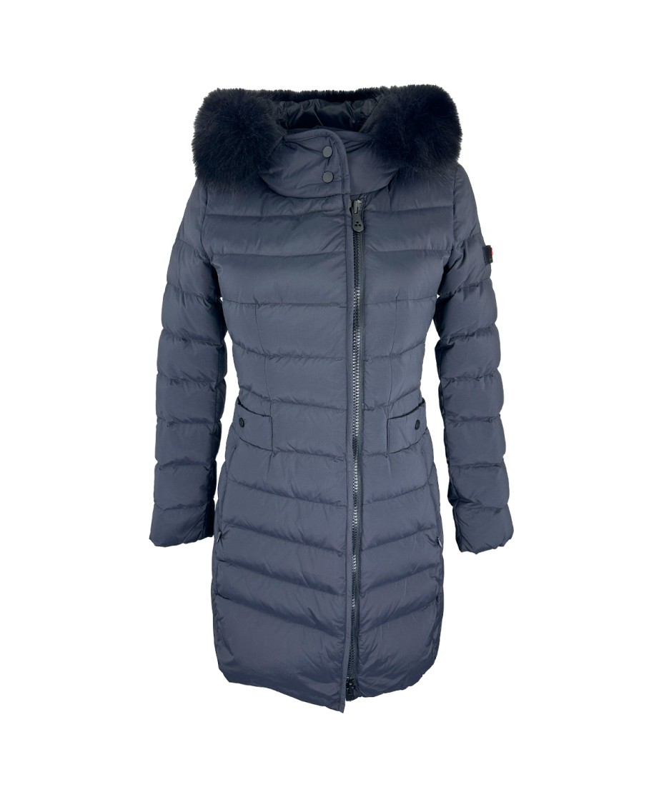 Piumino lungo trapuntato in leggero popeline di nylon e microfibra di poliestere, trattato ad alta temperatura per ottenere una mano sostenuta e un tatto polveroso, poi reso estremamente morbido grazie a un finissaggio al silicone. L’imbottitura in piuma naturale certificata assicura protezione termica con leggerezza, mentre il trattamento idrorepellente mantiene il comfort anche in caso di pioggia leggera. Il design è definito da una zip centrale a doppio cursore, collo avvolgente con bottoni a pressione tono su tono e cappuccio con bordo in pelliccia di volpe, removibile. Le tasche laterali con bottone a pressione completano un capo raffinato e funzionale, perfetto per l’inverno in città.
