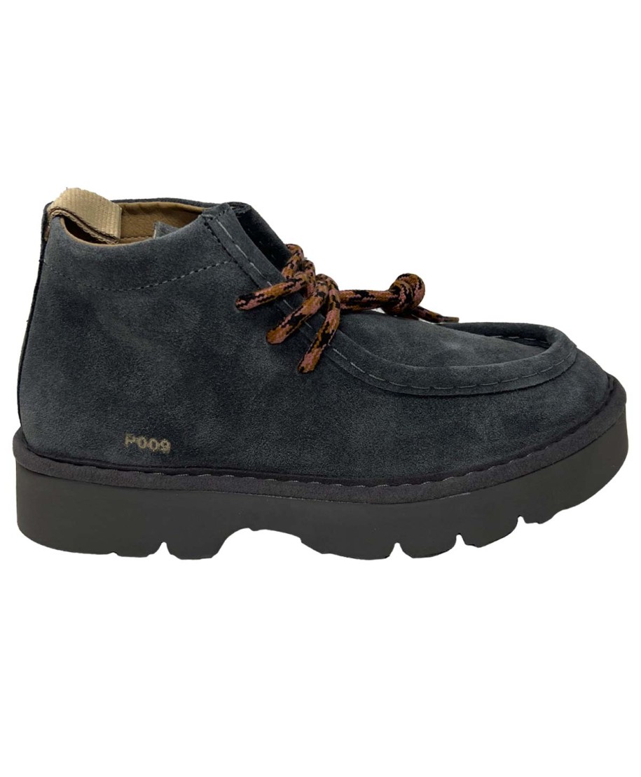 Polacchino donna P009 con tomaia di camoscio blu e bordature abbinate. Fodera interna di microfibra e lacci tondi tricolore.